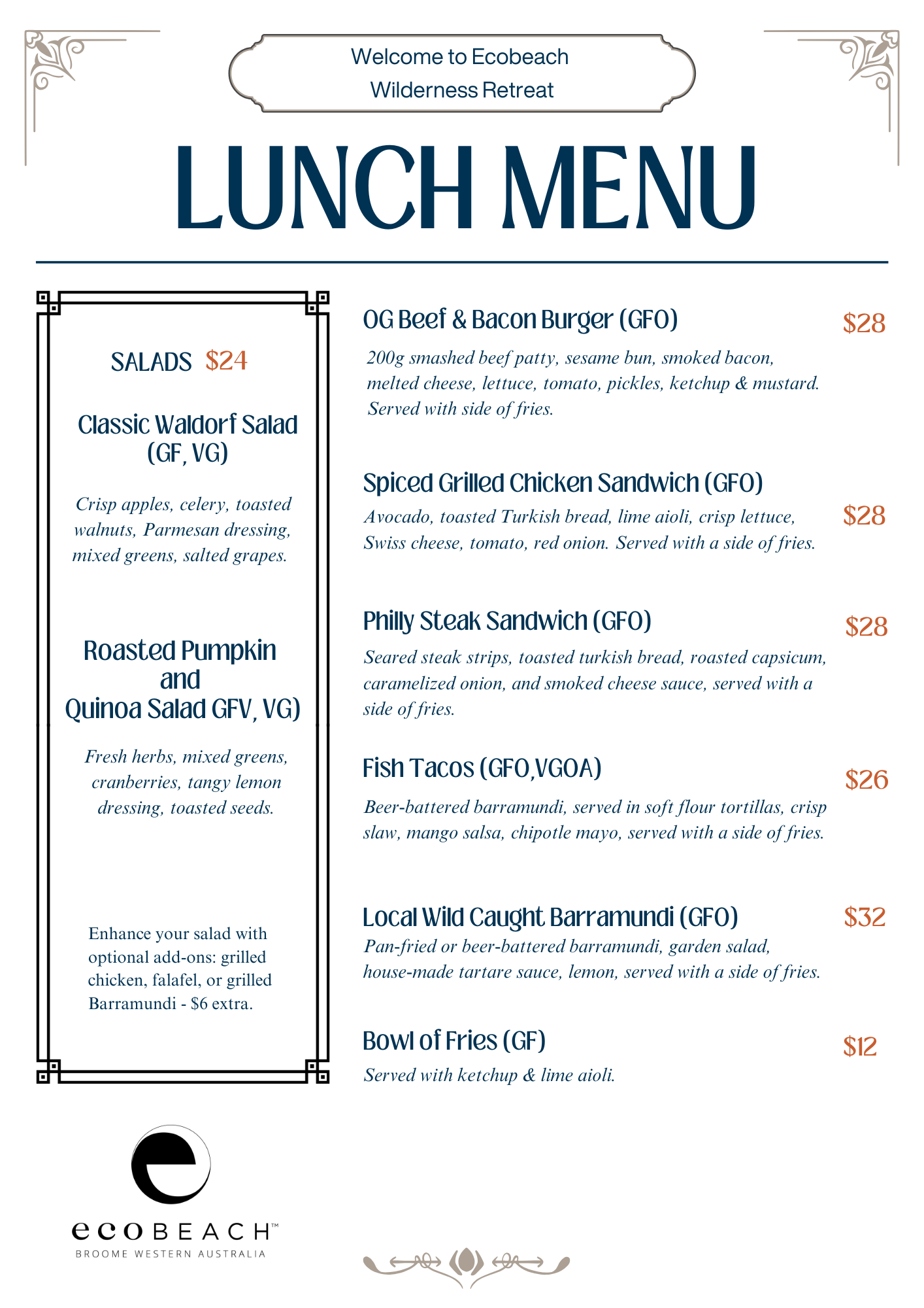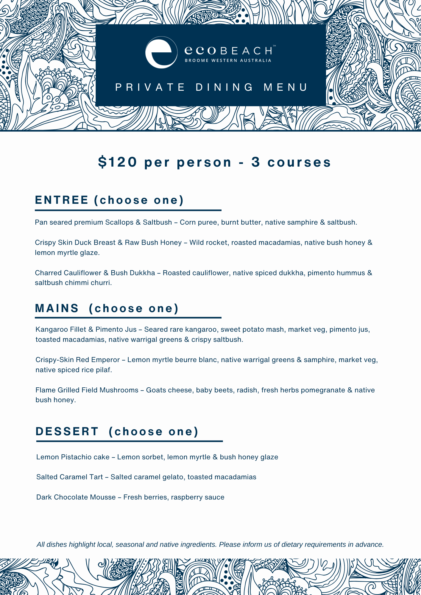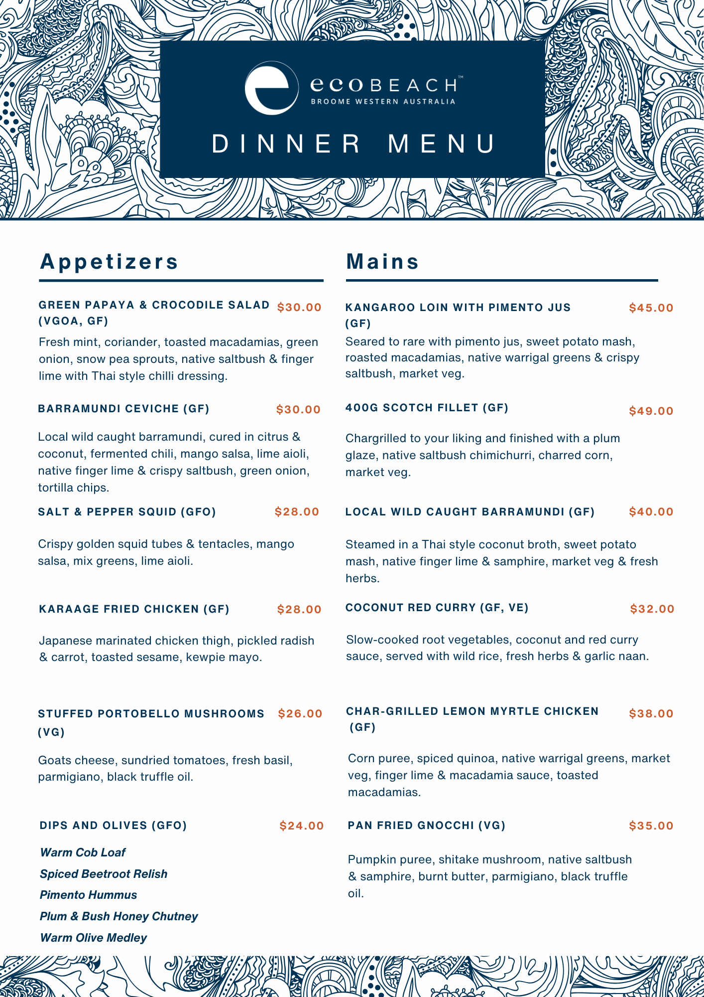 Great chefs, great food, plenty of choice on the menu, creative and fresh. Highly recommend for people staying at Eco beach or making a day trip from Broome. Billie12GoldCoast – Tripadvisor.